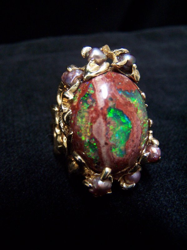 LAYAWAY AVAILABLE This stone is a Mexican boulder opal which is scattered with the naturally occurring quartz. The opal appears to open up whole worlds within it's fiery windows. Marked 14kt and being 1 3/8th inches tall this ring is heavy and huge. The width is just a tad over one inch. The mounting resembles sponge coral with the 6 pearls seated within the coral. The pearls are natural grays, black and mauve. The weight is 20 grams and the size is a 8.25. This ring may be sized by a professional jeweler. The condition is superb with no damage. This ring is expertly crafted. The stone and arrangement of pearls makes this treasure one of a kind.