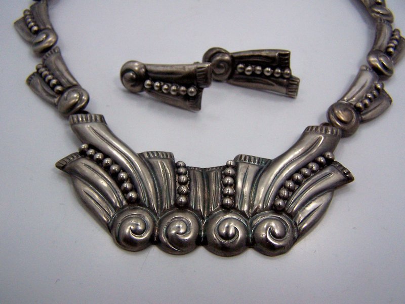 This is an old pre-1948 repousse necklace with great depth and dimension. The drop makes it's presence known but is still a size that can go to the board room with ease. The drop is 3in. across and 1.5in. tall. It is puffy repousse but still weighs in at a hefty 61 grams. The earrings and links are 1.25 in. long. The bead work is all hand applied which was labor intensive. No dents and no repairs or damage. You do not find pieces with this much panache very often and with a fabulous pectoral as well,just LOOK AT THAT NECKLACE!