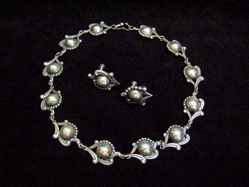 This is an old linear hallmarked Los Castillo necklace that was definitely designed by Margot. The silver is heavy repousse and the weight is 68 grams. The length is 15.75in. long and .75in. tall. This is a beautiful floral that lends itself wonderfully when you want to wear something not really big in size but packs a punch with design elements. What sets this set apart from the rest is it's condition. Due to age most pieces of this design are dented or have smashed repousse leaves and this set has none of that. The earrings are also Los Castillo but bare the round hallmarks and are of the identical design number of 595. The earrings are one inch tall and .75in. wide. Their weight is 10 grams heavy. Beautiful, just LOOK AT THAT NECKLACE!