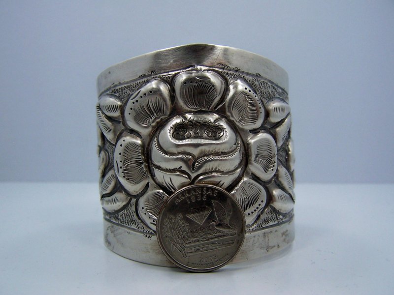 Sanborns heavy, deeply repoussaged and expertly carved bracelet is a mammoth 2.5in. tall. The weight is 73 grams heavy. This is another cuff in fabulous condition with no issues what so ever. I am featuring 3 fine open backed repousse cuffs in tonight's listings as the biggest ones are getting hard to get. Grab one while they are still around.