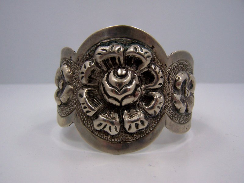 This is an old Mexico City early repousse cuff. I love the romantic shape and the expert carving on this piece. The flowers are very deep and the dimension is outstanding. The front face is a large 2in. tall. The back is tapered to a not so small 1.25 inches. The repousse is open backed and also bares no hallmarks which is indicative of the earliest Mexico City pieces. The condition is superb with no cracks or dents.