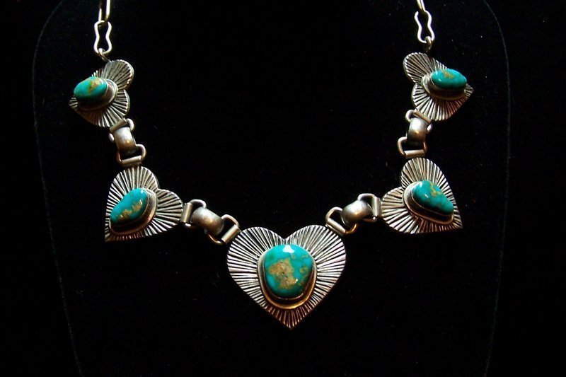 Hallmarked with a spur and signed Randy Boyd who is a Navajo artist, created this piece with nothing but quality to each detail. The hearts are thick silver with the sun chasing and gorgeous blue turquoise. The links are hand made with thick silver and ending with a hook. The largest heart is 1.5in. tall for the drop. It is built on a curve with the drop but it is at least 18in. long. The weight is 81 grams heavy. A perfect piece for the collector,just LOOK AT THAT NECKLACE!