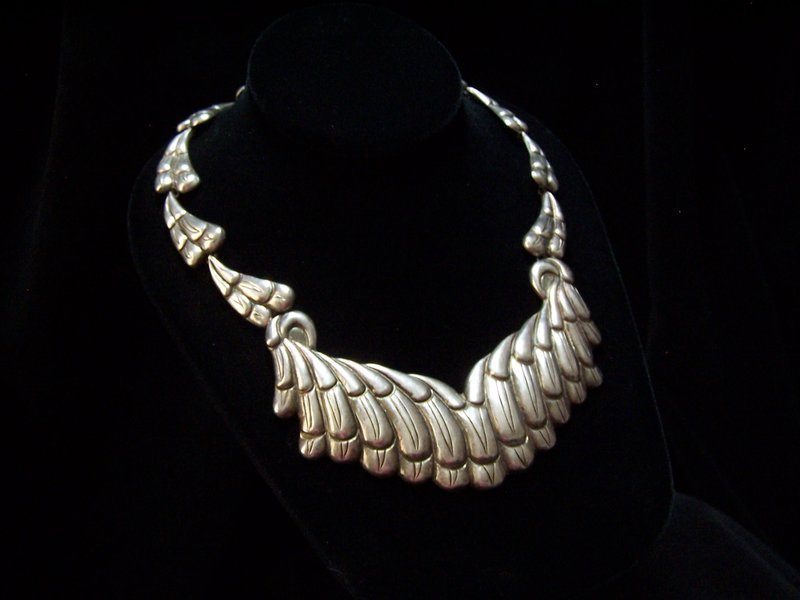 This Mexican silver pectoral is hallmarked 940, MEXICO, TAXCO with a conjoined MS and is a noted Maestro in Bille Hougart's book "THE LITTLE BOOK OF MEXICAN SILVER TRADE AND HALLMARKS." The length is approximately 17.5in. wearable and the weight is 75 grams heavy. The drop measures 4.75 across with 2.75in. tall. One of the pictures pairs the necklace up with the Valentin Vidauretta earrings and bracelet also listed on my site and sold separately. This pectoral displays a tasteful size with superb condition, just LOOK AT THAT NECKLACE!